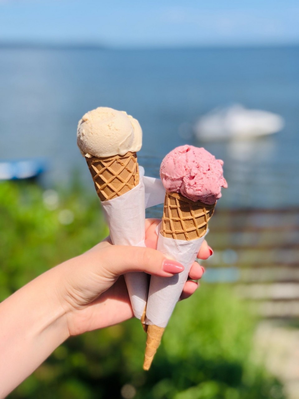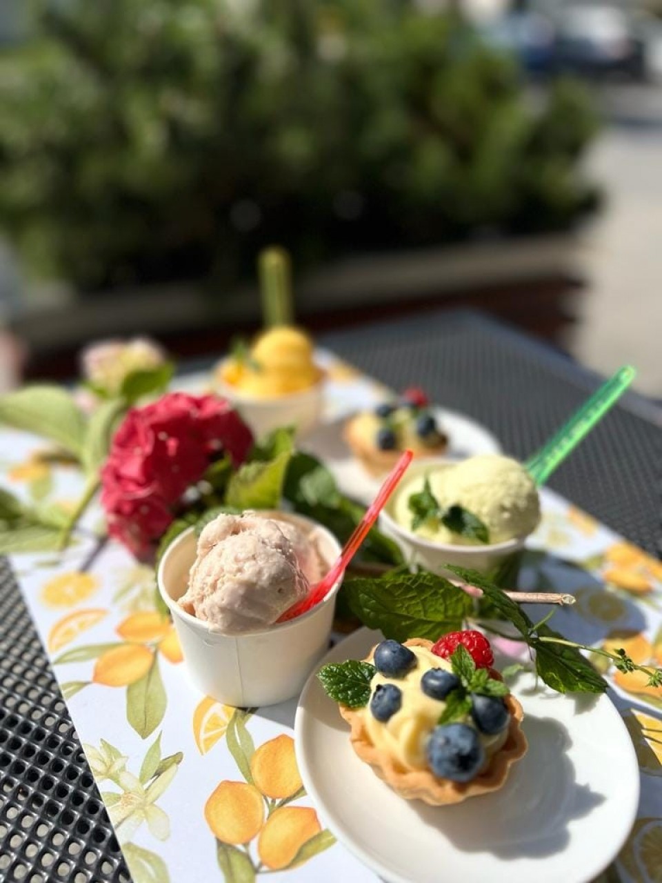 Kawy na ciepło i na zimno, herbaty - czarne, zielone, czerwone, aromatyzowane i rooibos, mrożone. Ciasta: serniki, torty i tarty, bezy, ciasta kruche i jogurtowe. Rurki z kremem, galaretki, gofry, soki wyciskane, lemoniady, koktajle mleczne i na bazie jogurtu typu greckiego, tradycyjne, rzemieślnicze lody.